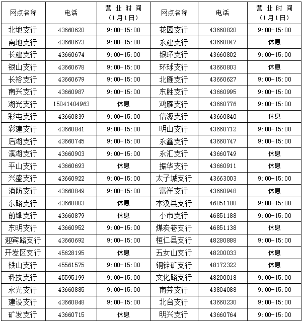 按照国务院办公厅关于2025年节假日安排,结合实际情况,2025年1月1日营业网点仅办理个人业务,1月2日恢复正常营业。网点具体营业时间安排如下,敬请周知。在此期间欢迎您使用本溪银行手机银行、网上银行、自助设备等渠道办理业务,详情可致电我行客服电话024-96178,由此带来的不便敬请谅解。