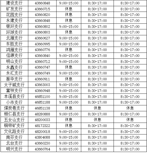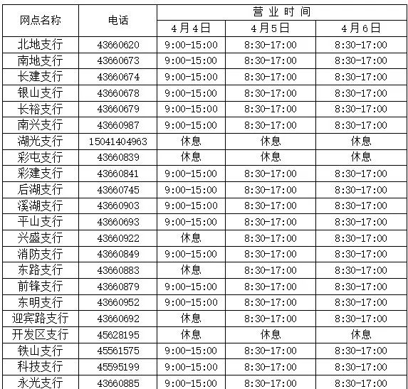 按照国务院办公厅关于2025年节假日安排,结合我行实际情况,2025年4月4日至4月6日营业网点仅办理个人业务,4月7日恢复正常营业。网点具体营业时间安排如下,敬请周知。在此期间欢迎您使用本溪银行手机银行、网上银行、自助设备等渠道办理业务,详情可致电我行客服电话024-96178,由此带来的不便敬请谅解。
