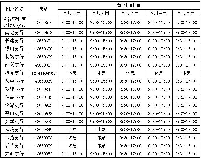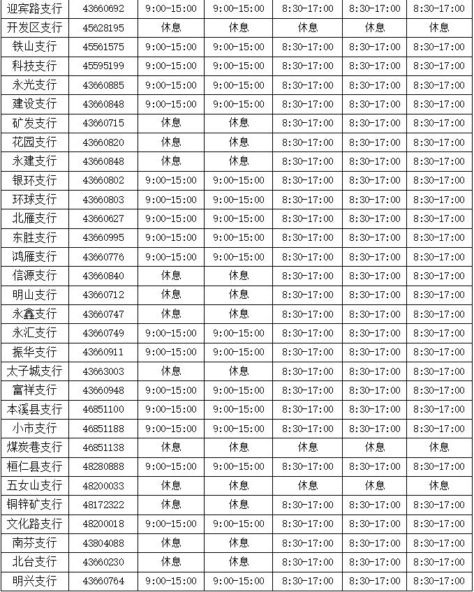 按照国务院办公厅关于2025年节假日安排,结合实际情况,2025年5月1日至5月5日营业网点仅办理个人业务,5月6日恢复正常营业。网点具体营业时间安排如下,敬请周知。在此期间欢迎您使用本溪银行手机银行、网上银行、自助设备等渠道办理业务,详情可致电我行客服电话024-96178,由此带来的不便敬请谅解。